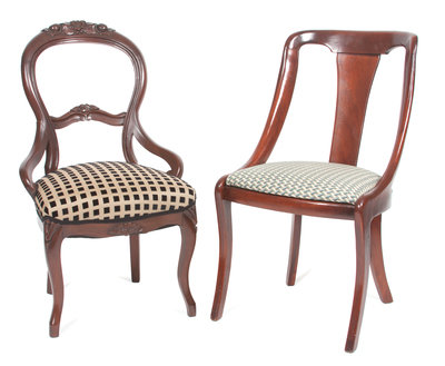 including a carved Victorian and an Empire gondola chair, having matched upholstered seats.
