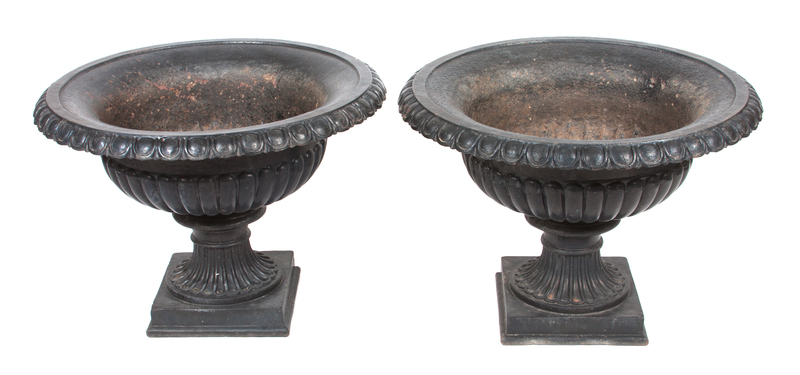 each having a circular rolled rim decorated with egg and dart over a gadrooned tapering body on a plinth base.