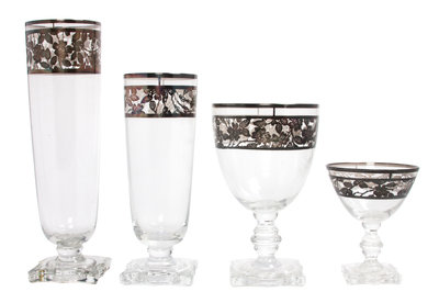 each with a metallic glaze overlay around rim, set on a square base with scalloped edge, comprising: 10 pilsner10 wine9 water5 sorbet34 items total.