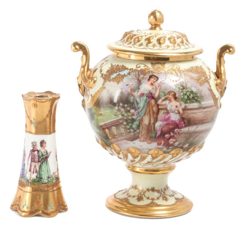 the first a lidded and handled urn depicting Classical figures in a landscape with gilt decoration, the second a bud vase depicting figures in period costume with gilt decoration.