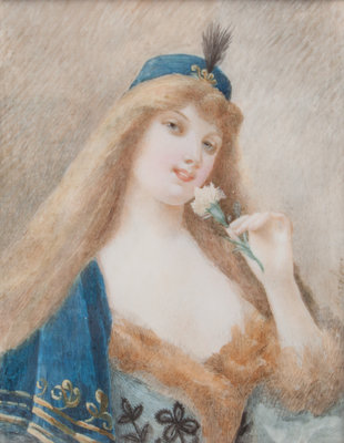 depicting a female holding a flower, signed Margfoy, set in a bronze frame.