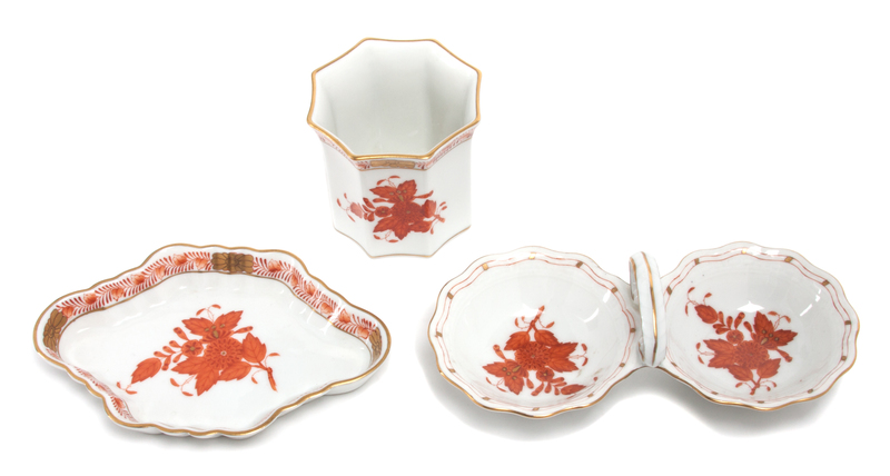 in the Chinese Bouquet Rust pattern, comprising a double ring holder, an octagonal vase, and a lobed dish.