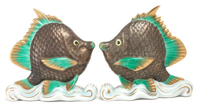 in the Chinese Bouquet Rust pattern, comprising a flared vase, an ash receiver, a circular dish with koi finial, and a pair of salt and pepper casters, together with a pair of Herend porcelain figurines in the forms of fish, 7 items total.