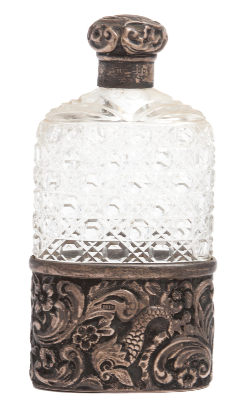 having a cut glass bottle mounted in a silver base with silver top.