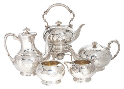 comprising a kettle on stand, teapot, coffee pot, creamer, sugar, and waste bowl, 6 items total.