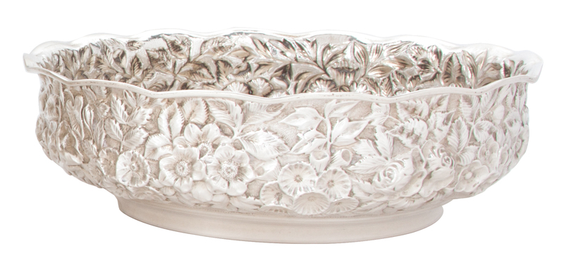 the circular bowl with scalloped rim and floral repousse work to sides.