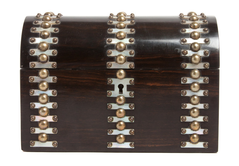 having mother-of-pearl and brass decorating the hinged domed lid.