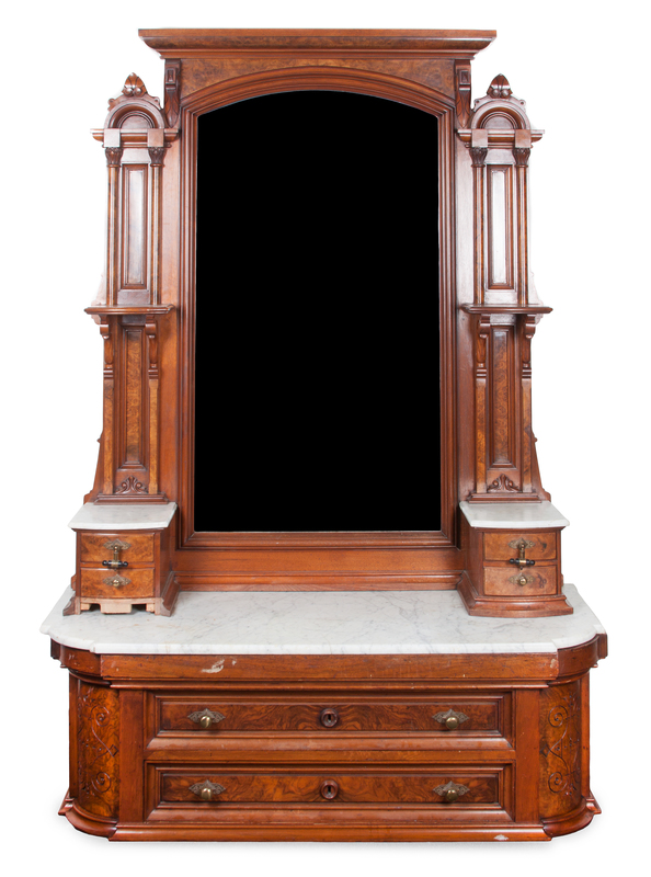 having a foliate carved crest over the vertical rectangular plate flanked by candle shelves and glove boxes, the base set with two long drawers.