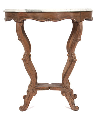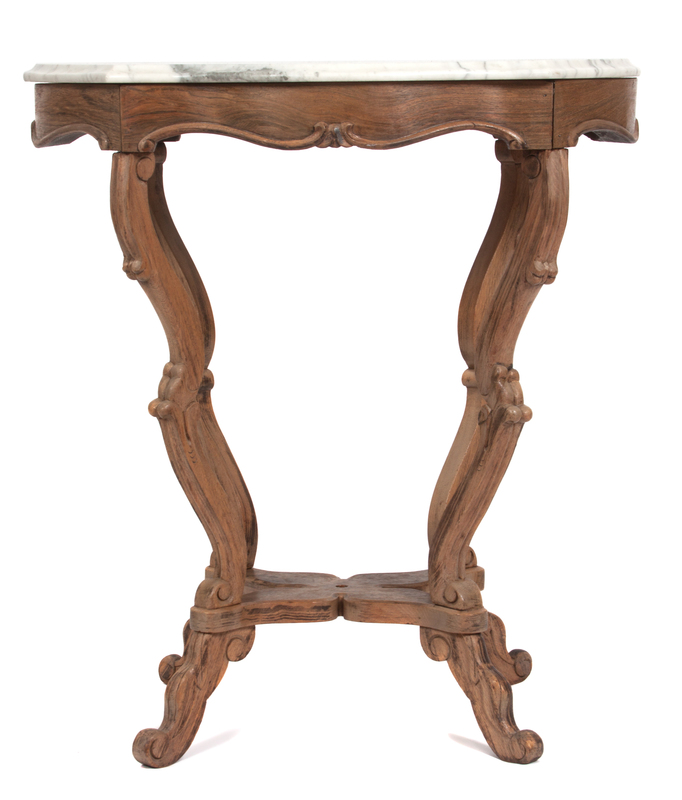 having a shaped top set on a conforming base, raised on four legs joined by medial shelf.