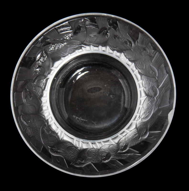 of circular form with a continuous border of birds along rim, etched Lalique France.