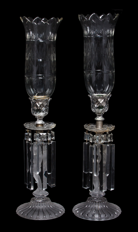 each formed as a cherub holding a torch, having hurricane shades and hung with prisms, stamped underside.