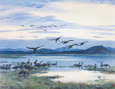 Honkers Flighting Down River at Dusk, 1978
