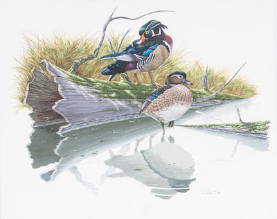 Ducks on a Log in Pond