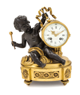 the circular dial signed Berthoud a Paris and having Roman numeral hours and Arabic numeral minutes, the case cast as a putto supporting the clock formed as a pocket watch, raised on toupie feet.