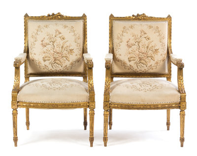 A Pair of Louis XVI Style Giltwood Fauteuils