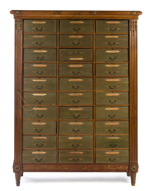the reeded cornice and fluted supports enclosing 30 leather-bound storage boxes.