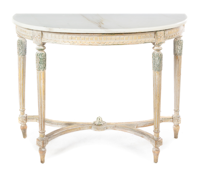 having a demilune marble top above a fluted frieze, raised on fluted cylindrical tapering legs joined by stretchers.