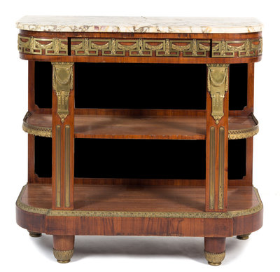 having a rectangular marble top with rounded front corners over the conforming frame set with two swing out drawers and two shelves.