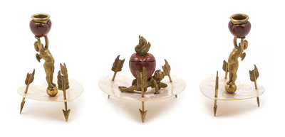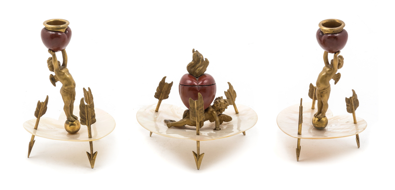 each having a heart shaped underplate, the inkwell with a hinged lid surmounted by a flame finial and opening to a porcelain liner, supported by a reclining Cupid, together with two similarly decorated candlesticks in the form of Cupid standing atop an orb, all raised on three legs in the form of arrows.