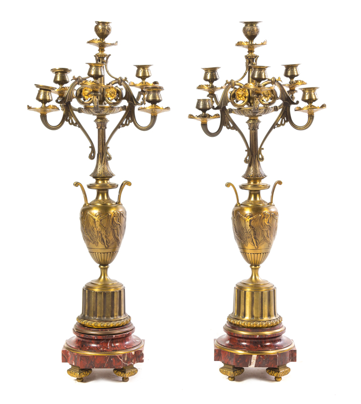 each having a handled urn with a continuous band of dancing classical figures issuing seven foliate scroll candle arms, the urn raised on a fluted circular base ending in a shaped rouge marble foot.