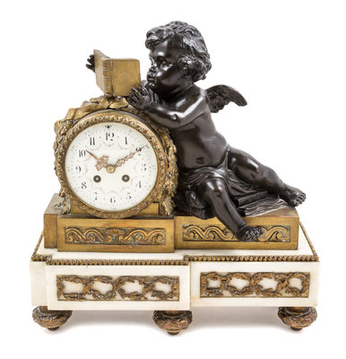 A Louis XVI Style Gilt and Patinated Bronze and Marble Mantel Clock