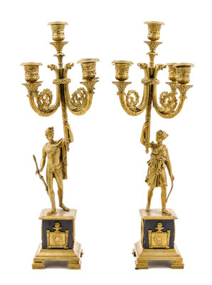 A Pair of Empire Style Gilt and Patinated Bronze Five-Light Candelabra