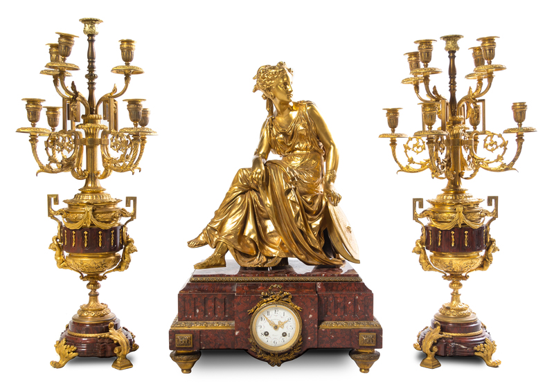 A Large French Gilt Bronze and Marble Clock Garniture