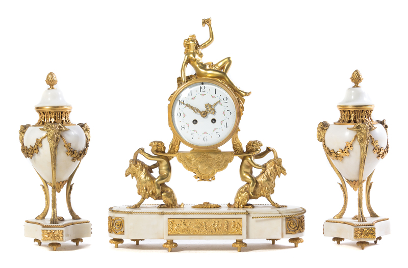 A French Gilt Bronze and Marble Clock Garniture