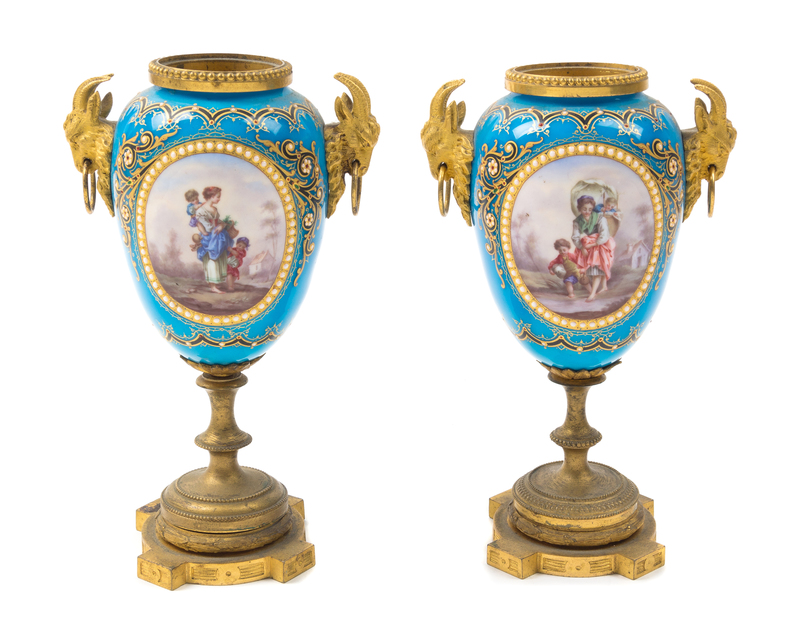 A Pair of Sevres Style Gilt Bronze Mounted Porcelain Urns
