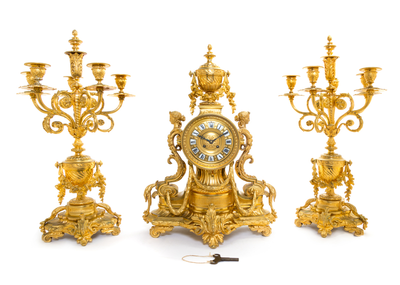 the clock having a floral swag-draped urn above a circular segmented dial with Roman numeral hours, flanked on each side by female busts, raised on a shaped base ending in foliate scroll feet, together with a pair of similarly decorated six-light candelabra.