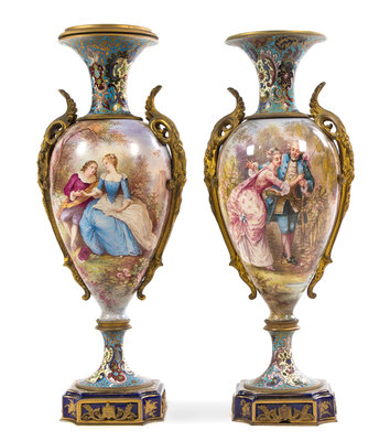 A Pair of Gilt Bronze Mounted Sevres Porcelain and Champleve Urns