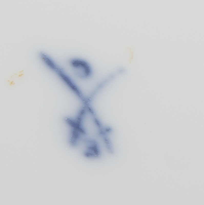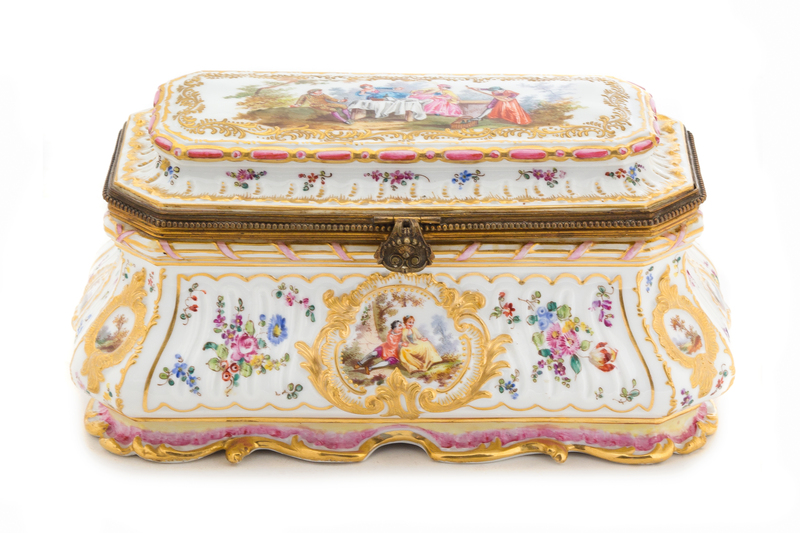 of shaped rectangular form having a white ground decorated with floral sprays and gilt highlights, the hinged lid painted to show revelers in a landscape and opening to a fabric lined interior, the sides decorated with cartouches depicting a courting couple and various landscape scenes, having a crossed swords mark in underglaze blue to the underside.