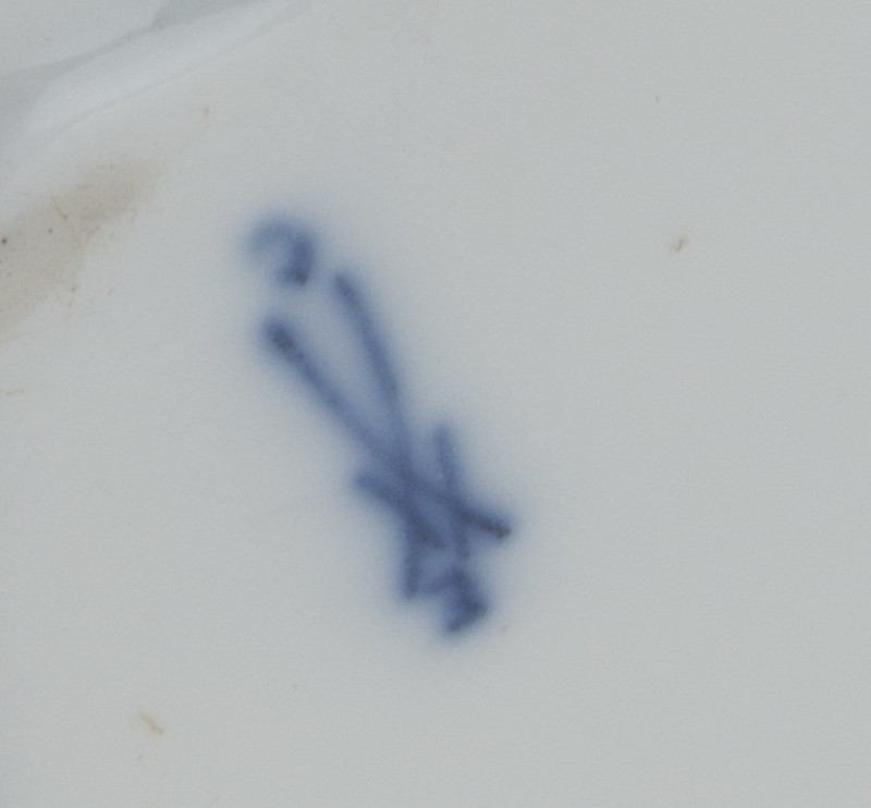 of cartouche form, having a white ground and polychrome gilt highlighted borders with rocaille motifs and floral cartouches, the domed hinged lid painted to show figures in a landscape and signed Watteau, the similarly decorated sides painted to show various landscapes, having a crossed swords mark in underglaze blue to the underside.