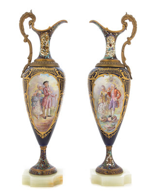 A Pair of Gilt Metal Mounted and Champleve Sevres Style Porcelain Ewers