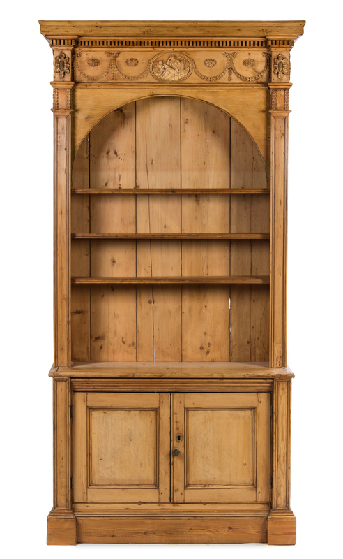 the stepped cornice over a block front frieze worked to show rosettes, foliate swags and a figural medallion, above a series of four shelves and two paneled cupboard doors raised on a conforming plinth base.