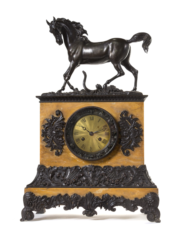 cast with a horse stepping over a snake, the circular dial with Roman numeral hours set into a rectangular plinth.