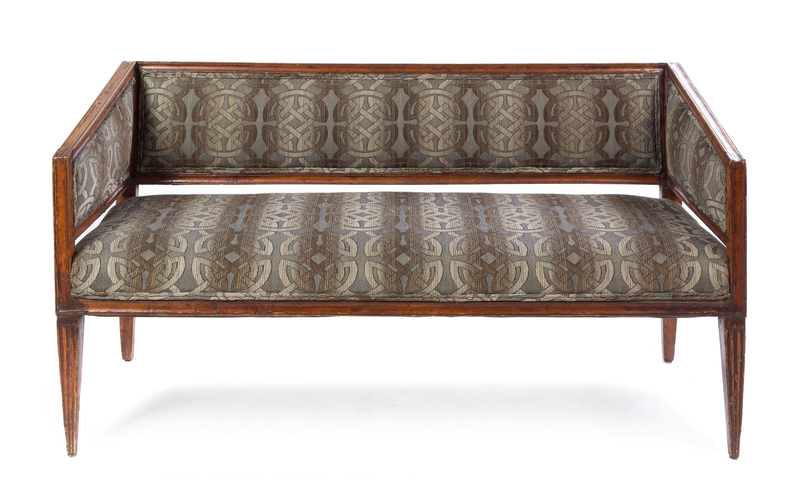 having a straight crest rail above a padded back, arms and a stuffover seat, raised on square fluted tapering legs.