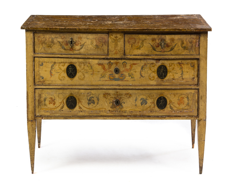 having a rectangular top above two short drawers and two long drawers, painted throughout to show foliate scrolls and winged creatures, raised on square tapering legs.