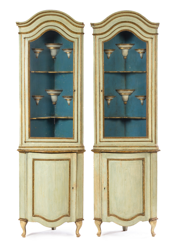 each having a domed cornice over a glazed door opening to a fitted interior with brackets for displaying porcelain, the lower sections with doors, raised on short cabriole legs.