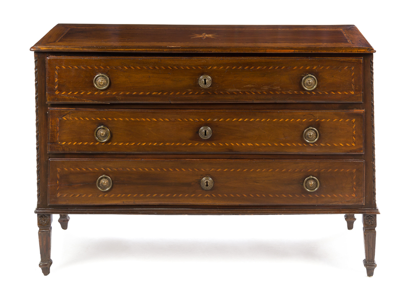 the rectangular top having star decoration within a crossbanded border over three long drawers, raised on square tapering legs ending in caps.