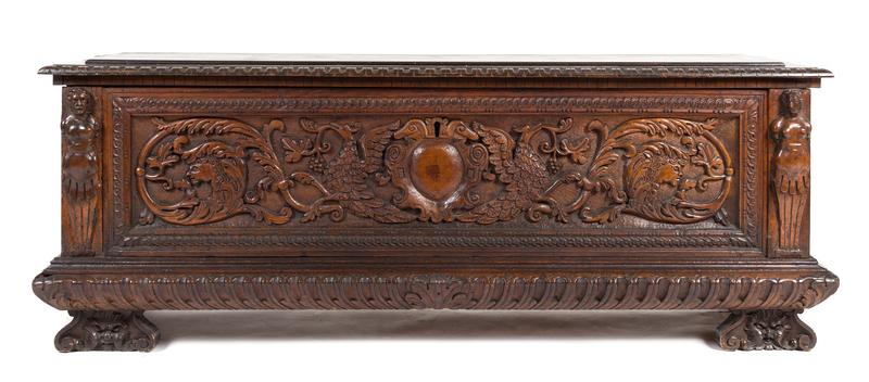 the front of the case carved to depict birds, foliate scrolls and mythical beasts issuing from a cartouche.
