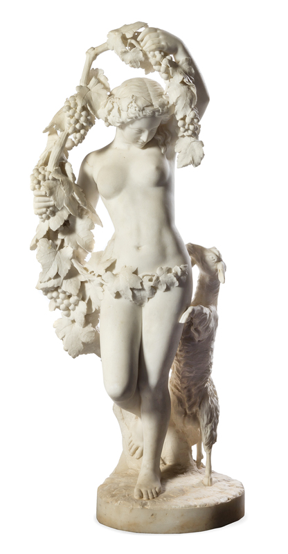 depicting a maiden hoisting a grapevine above her head while a sheep leans against her side, raised on a naturalistic base, apparently unsigned.