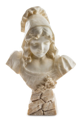 depicting a young woman wearing a dress with capped sleeves, a floral spray to her bust.