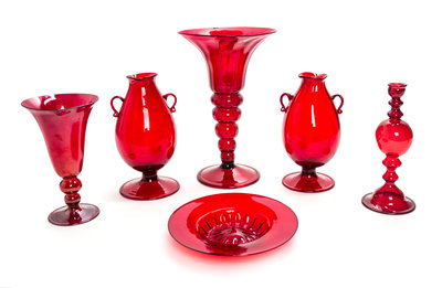 comprising a compote, two vases of handled ovoid form, a chalice, a candlestick and an ash receiver.