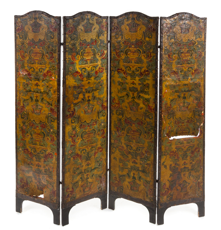 A Spanish Tooled Leather Four-Panel Floor Screen