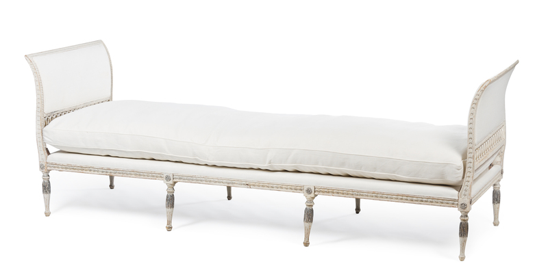 the rectangular cushion seat flanked by outsplayed arms, raised on foliate capped fluted cylindrical legs.