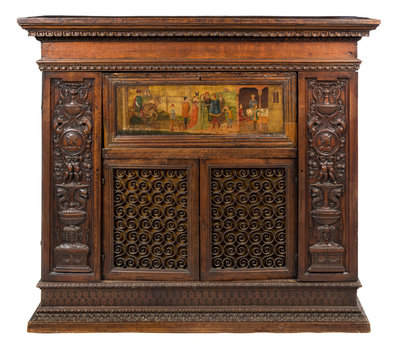 having a dentiled cornice above a fall front opening to a fitted interior and two paneled doors flanked by additional doors, the fall front exterior painted with a figural scene.