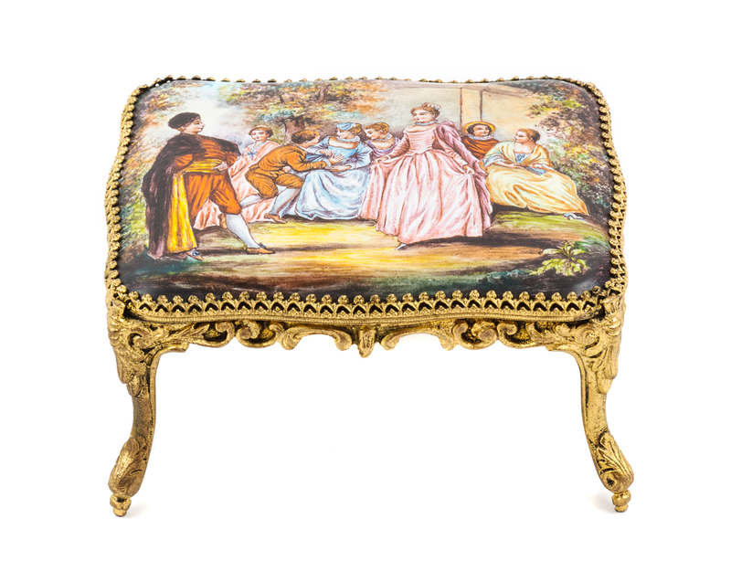 in the form of a table having a shaped rectangular top depicting a bucolic dancing scene above a frieze worked to show C-scrolls and foliate decoration, raised on cabriole legs, stamped AUSTRIA to the underside and REUGE STE. CROIX to the wind.