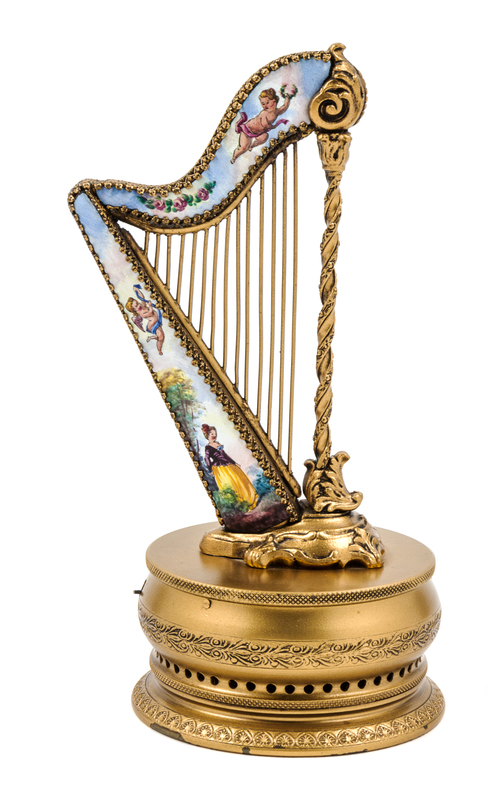 in the form of a harp, the enamels decorated with a courting couple and cherubs.