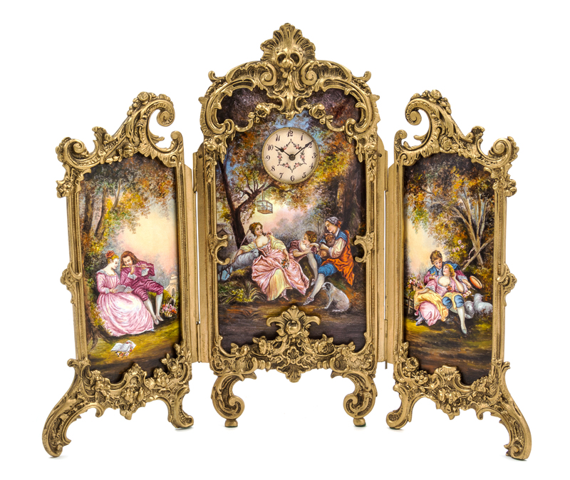 the central panel inset with a circular clock dial having Arabic numeral hours and further depicting a gentleman playing a bagpipe with a lady and a shepherdess, flanked on each side by a panel depicting a courting couple in a forest.